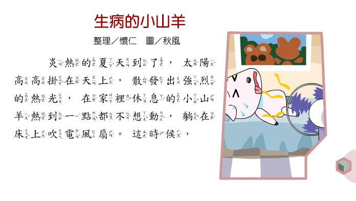 過了一會兒,山羊媽媽買菜回來了,卻看到小山羊躺在床上呻吟,著急的問說:「孩子,你是身體哪裡不舒服呢?告訴媽媽。」小山羊說:「媽媽,我的肚子好疼。」山羊媽媽趕緊帶著小山羊去看猴子醫生,猴子醫生檢查之後,問小山羊說:「你是不是有吃什麼東西呢?」小山羊小聲的說:「我剛剛吃了三支水果冰棒。」猴子醫生笑著說:「那是因為吃太多的冰棒,才會讓肚子不舒服,吃點藥就好了,夏天吃東西時,不可以過量,還要注意食物的衛生,不然肚子又會不舒服了,一定要記住『病從口入』。」小山羊不好意思的說:「謝謝醫生,我知道了。以後吃東西的時候會特別注意,不敢隨便買路邊的東西吃了。」