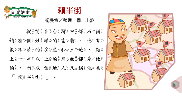 Once upon a time in Shi-gang Town in Central Taiwan, there was a rich man whose surname was Lai. He owned many houses and lots of lands. More than half of the houses lining the streets belonged to him. So, the locals called him “Half-Street Lai.”